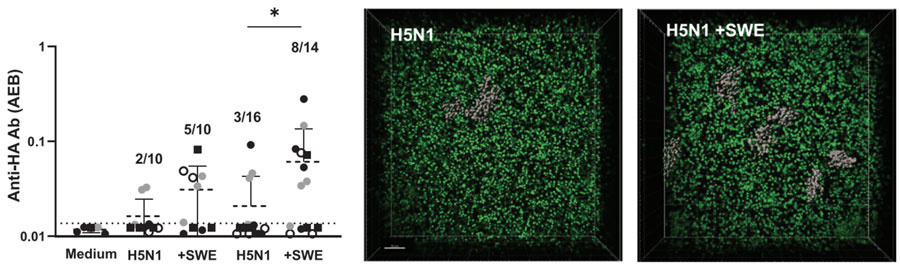 リンパ組織チップは、不活化H5N1 ウイルス処理後に抗HA 抗体生成を示します。