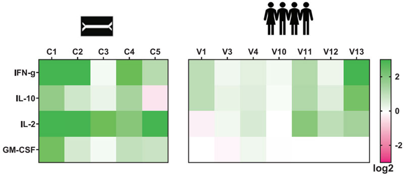 リンパ組織チップは、ワクチン接種後3 日(C1-5)において、未接種のチップと比較して臨床的に関連性のあるサイトカインの変化を示しました。チップで観察された変化は、ワクチン接種後1 日目の7 名(V1、3、4、10–13)の末梢血における変化と、接種前のレベルと比較して類似していました。