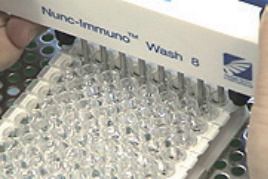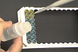 反応後、プレートの各ウェルを洗浄します。ウェルの底に洗浄試薬が残らないように注意して下さい。