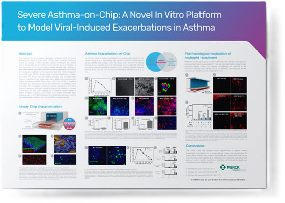 重症喘息に対する新しい治療薬の開発に向けて、体液の流れを経験する微小血管内皮に裏打ちされた、完全に分化した粘膜繊毛性気管支気管支上皮を含む3D微小生理学的ヒト気道チップを開発しました。小児および成人における喘息増悪の主要な原因であるヒトライノウイルス(HRV)に感染させると、気道チップは繊毛細胞の死、杯細胞の過形成、IFN-α2、IFN-λ1、CXCL10、CXCL11などのサイトカインの放出、さらに循環するヒト好中球の内皮を介した動員および遊走を特徴とする炎症性応答の誘導を示しました。