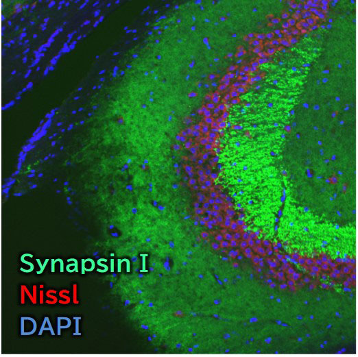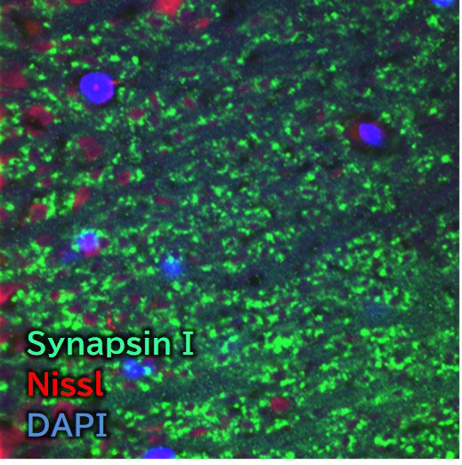 シナプシンはシナプス小胞結合タンパク質の一種で、シナプス小胞の動態制御に関与していると考えられています。主に神経終末に局在していることから、免疫組織染色などにおいて前シナプスマーカーとして利用されています。当社では多重染色に有用なモルモットの抗シナプシンI抗体を取り扱っております。