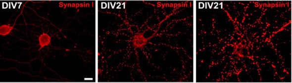 培養7日目にはシナプスはほとんど形成されていないが、培養21日目には顕著な粒状のシナプスが多数観察された。培養細胞はターンオーバーが早く、細胞体においては小胞体で合成中あるいは軸索輸送中のシナプシンIが弱い蛍光として検出されたと考えられる。