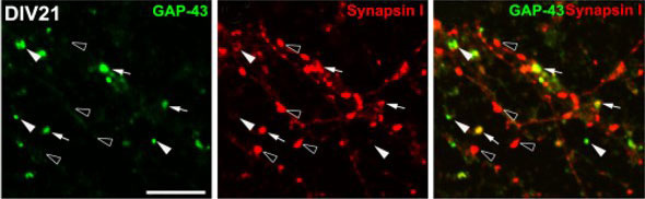 ラット海馬 初代培養神経細胞のシナプス (白矢印) において、GAP-43とシナプシンIの共局在が認められた。