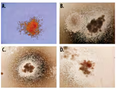 A. バースト形成単位-赤血球系(BFU-E)コロニーは、7日目以降に観察可能な30細胞以上のクラスター。個々のクラスターは、融合したように見える小さな不規則な形状の細胞から構成されている。通常5~8個の細胞を含み、クラスターのサイズは単一の巨噬細胞と類似していた。クラスターのサイズや色は多様で、大きなBFU-Eは通常鮮やかな赤色を呈し、顕微鏡を使用しなくても識別可能である。小さなBFU-Eは赤色を呈しない場合もあるが、形態に基づいて識別可能である。 B. コロニー形成単位-マクロファージ(CFU-M;左)は、マクロファージのクローン形成前駆細胞であり、均一なマクロファージ群を生じる。コロニー形成単位-顆粒球(CFU-G;右)は、好酸球、好塩基球、または好中球の均一な集団を生じる顆粒球のクローン形成前駆細胞である。 C. コロニー形成単位-顆粒球、マクロファージ(CFU-GM)は、マクロファージと顆粒球の異種集団を含むコロニーを生じる前駆細胞。形態はCFU-MとCFU-Gの記述と類似している。 D. コロニー形成単位-顆粒球、赤血球、マクロファージ、メガカリアサイト(CFU-GEMM)は、赤血球系、顆粒球系、マクロファージ系、メガカリオサイト系の多系前駆細胞。単一のコロニー内に赤色を呈する細胞(赤血球系)と無色細胞(顆粒球、マクロファージ、および巨核球)が混在する細胞として識別できる。この前駆細胞は通常、培養皿上で最も大きなコロニーを形成するが、まれにCFU-GMがCFU-GEMMと同等またはそれ以上のサイズに達する場合がある。