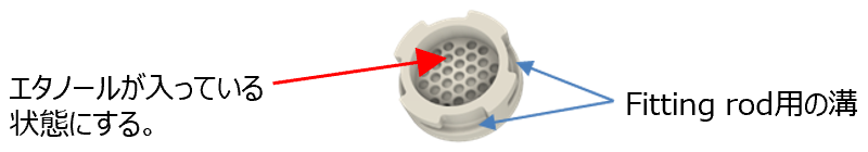 CuPS周囲のエタノールはキムワイプなどでふき取る。(CuPS外側にあるFitting rod用の溝のエタノールもふき取る。)