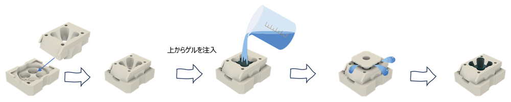 ベースカセットに包埋カセットをセットし、1.で用意したゲルを包埋カセットのくぼみに注ぎ入れる。(6割程度を目安)