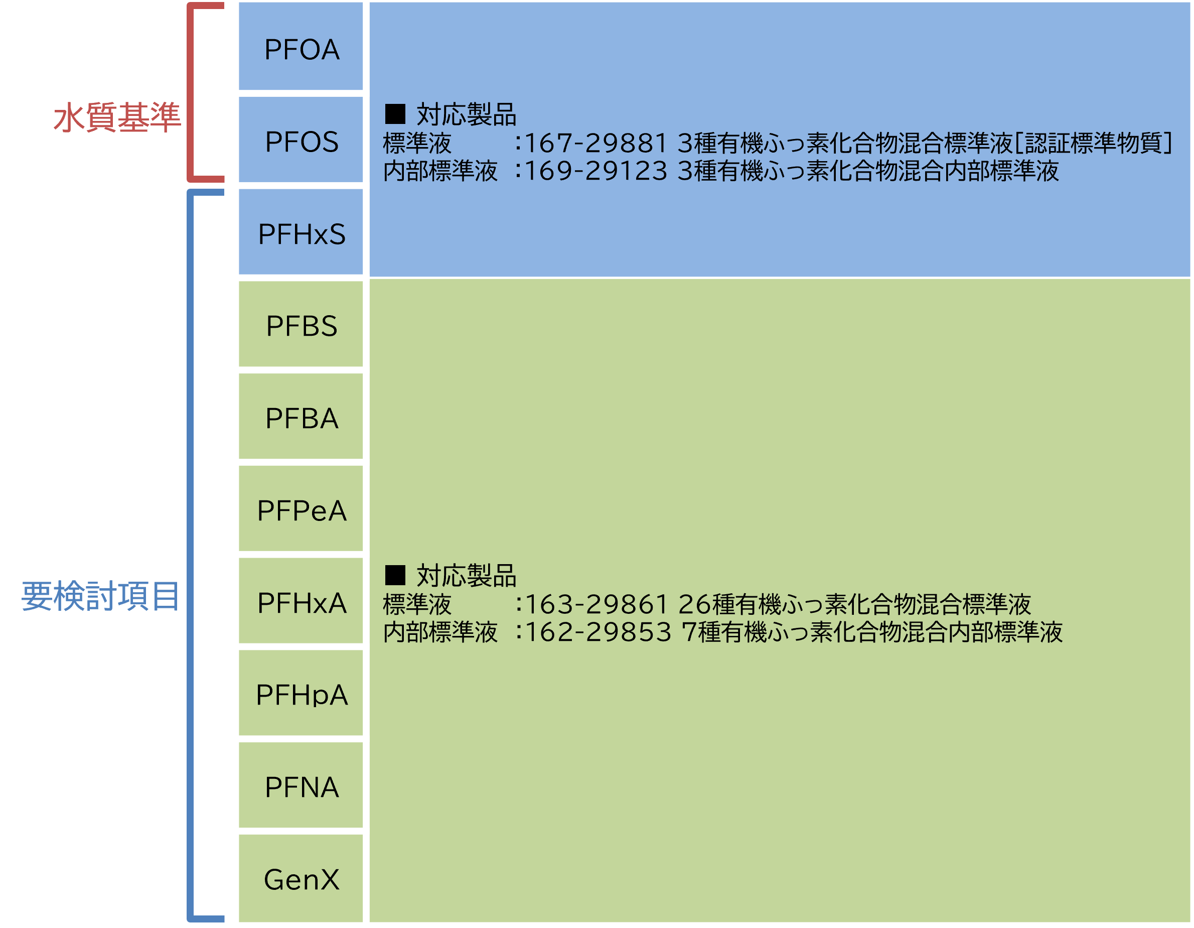 また、同日から要検討項目に追加される8種のPFASは、 3種・26種有機ふっ素化合物混合標準液および3種・7種有機ふっ素化合物混合内部標準溶液の4製品を組み合わせることで分析が可能です。