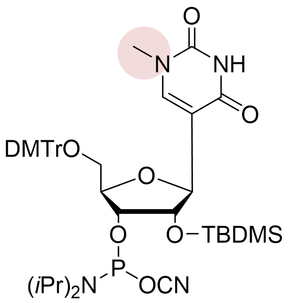 本製品は、シュードウリジンのアミダイトモノマーです。オリゴヌクレオチドの化学合成にご利用いただけます。