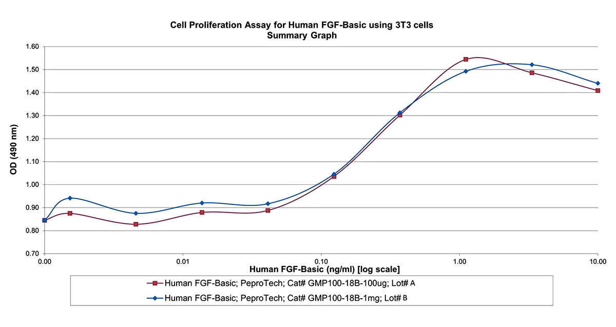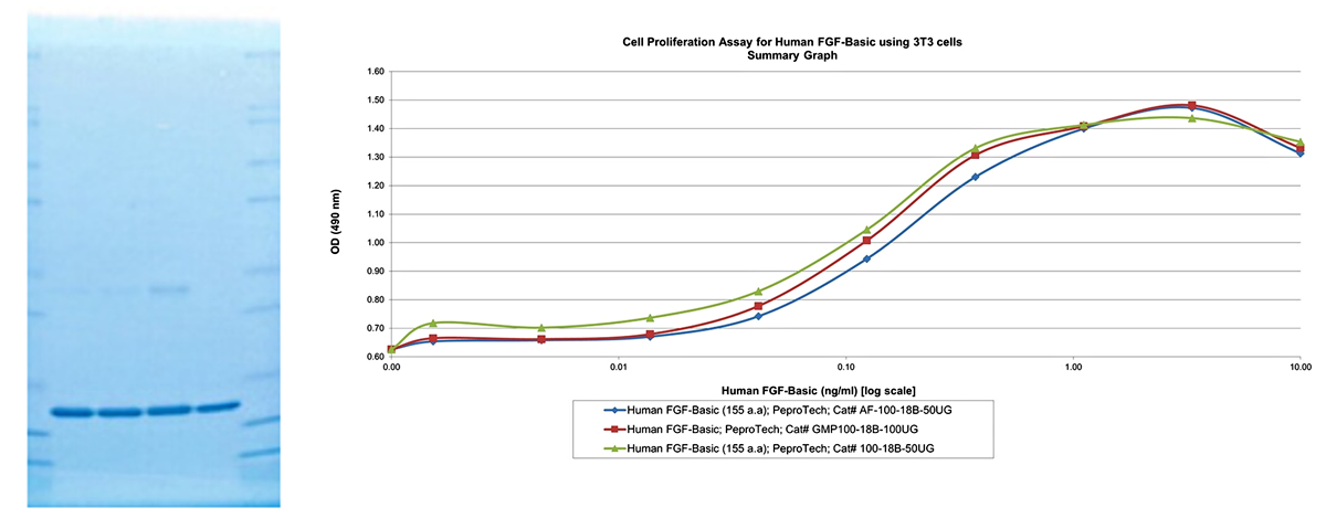 細胞増殖アッセイで、異なるラボとロットで製造された3種類のグレード(RUO、動物由来成分非含有、GMP)でのPeproTech FGF-Basicタンパク質の生物活性を証明 (右図)