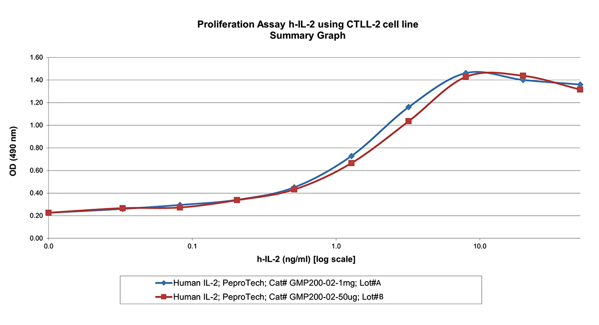 PeproGMPサイトカインは、細胞増殖アッセイで生物学的活性と有効性の試験が行われます。これらのロット間比較は、製造ロット間でPeproGMPサイトカインが一貫して有効であることを示しています。