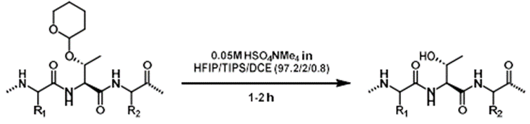 また、脱保護条件が強酸性ではないので、ペプチドの加水分解やN→O-アシルシフトを抑制することができます。