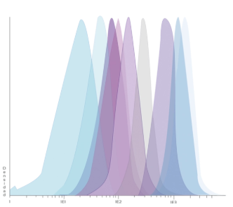 フローサイトメトリーにより、新鮮なエクソソーム (左上図) と凍結乾燥したエクソソーム (右下図) の様々なエクソソーム濃度におけるバックグラウンドノイズと特異的シグナルを比較した。