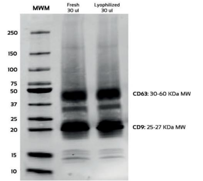 全てのエクソソーム標準バッチはFCM、WB、NTA分析を用いて検証されています。 また、凍結乾燥による影響を比較するため、全ての凍結乾燥バッチにおいて-20 ℃で保存した新鮮なエクソソームと比較しています。