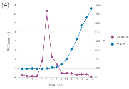 - (A) カラムの各分画中のタンパク質 (BCA) と細胞外小胞 (FACS CD63+/CD9+) の含有量を比較した。