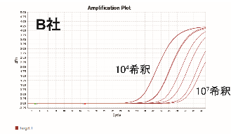 【結果】 本製品は他社試薬と比較して微量RNA試料 (107希釈) に対しても高い増幅効率が得られることが確認された。