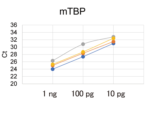【結果】 各遺伝子の各鋳型量において、本製品は最も低いCt値を示し、高い増幅効率が確認された。また、各鋳型量において高い直線性が得られたことから、鋳型濃度が低い条件でも安定した増幅が可能であることが確認された。