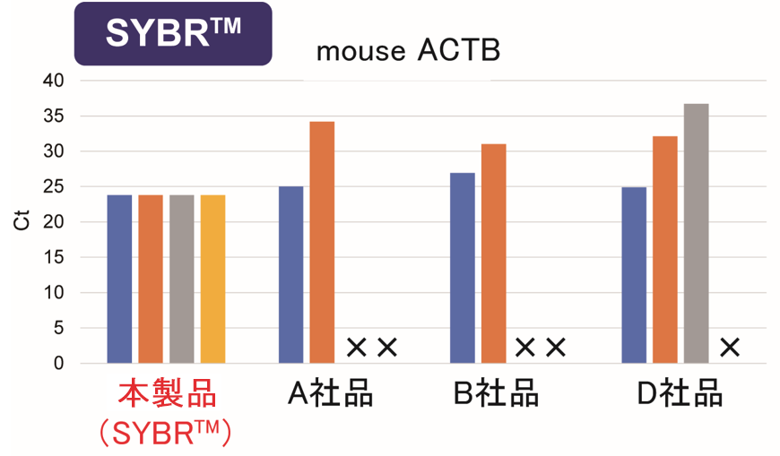 マウスから抽出したTotal RNA (1 ng、100 pg、10 pg) を鋳型として用いて、各社One Step RT-qPCR試薬を使用してCt値を比較した。PCRサイクル条件は、各社の推奨プロトコールに従って実施した。