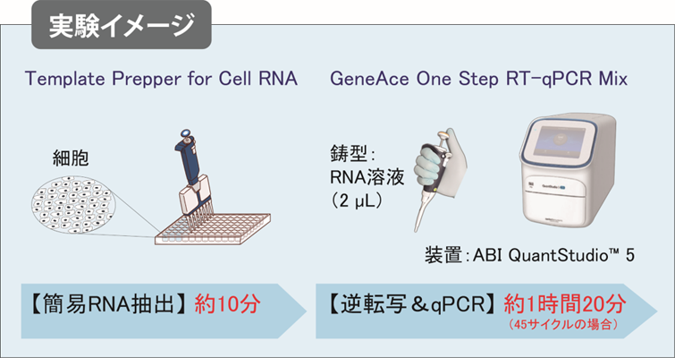【結果】 本製品と簡易RNA抽出試薬「Template Prepper for Cell RNA」を組み合わせることで、RNA抽出からqPCRまでの工程を大幅短縮することができた。