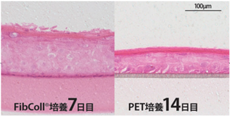 FibColl®やポリエチレンテレフタレート製セルカルチャーインサート (PET) のメンブレン上に、正常ヒト表皮角化細胞1.8 x 105 cellsを播種し、3日間の液内培養の後に14日間の気液界面培養へ移行した。その後、作製した各表皮モデルの凍結切片をHE 染色で観察した。