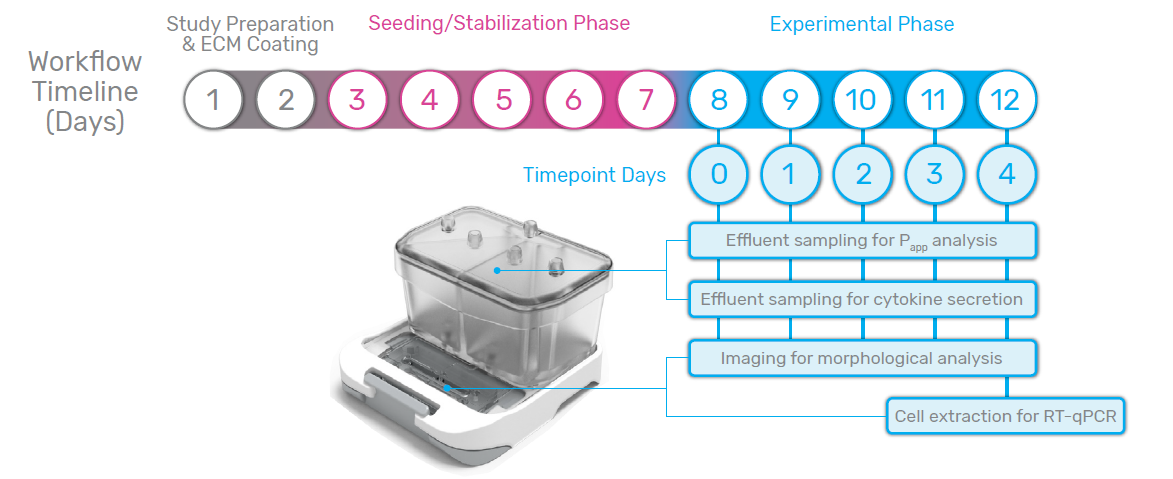 Brain-Chip R1 実験は12日間のタイムライン内で完了可能です。臓器チップの消耗品はまず播種準備を行い、その後細胞をチップ上に直接播種します。チップをフローに接続し、実験開始前に安定化させる。実験フェーズ (タイムポイント0~4日目) では、形態観察のための日次イメージングを実施可能であり、バリア機能の完全性やサイトカイン分泌を分析するための流出液サンプリングも行えます。実験期間終了時には、RT-qPCR などの下流解析のためにチップから細胞を回収できます。