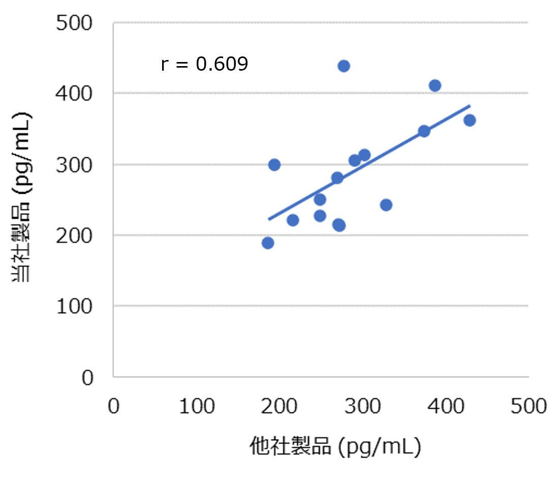 | 本製品 (pg/mL) | 他社製品 (pg/mL) | 本製品 (pg/mL) | 他社製品 (pg/mL) | 本製品 (pg/mL) | 他社製品 (pg/mL) | |