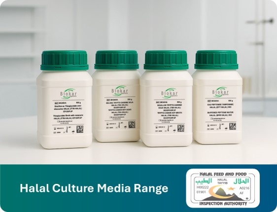 Solabia Biokar Diagnostics では、食品・化粧品・医薬品の微生物検査に対応した新しいHalal 認証取得の微生物検査培地シリーズをラインアップしております。 本シリーズは、ISO 規格および日本薬局方 (JP)、米国薬局方 (USP)、欧州薬局方 (EP) に準拠しており、500 g と5 kg 包装の粉末培地をラインアップしています。無菌検査、エアテスト、表面サンプリングなど、さまざまな品質管理試験に対応可能で、ブロスやプレート用培地に調製できます。