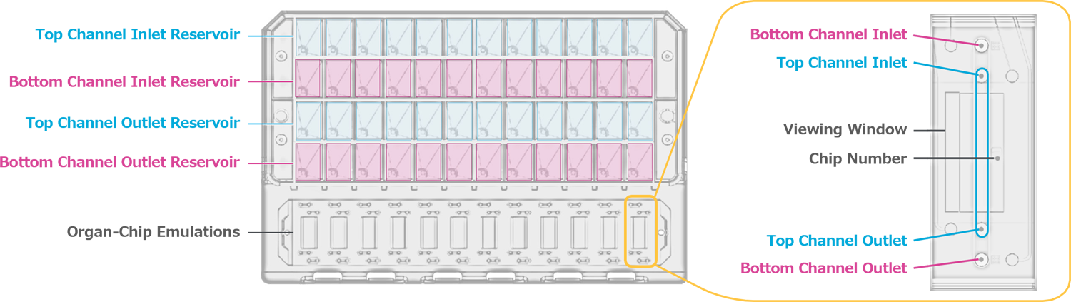 Top/Bottom チャネルそれぞれにIn/Out 用の独立したリザーバーを備え、1チャネルあたり最大1.3 mLの培地を保持できます。AVA™ Emulation System に接続することで、最大 3日間にわたる自動培地供給を実現し、培地の流れを継続的に管理できます。また、Outlet の培地排出液はマルチチャネルピペットや自動液体ハンドラーで容易に回収でき、エンドポイント解析に活用できます。