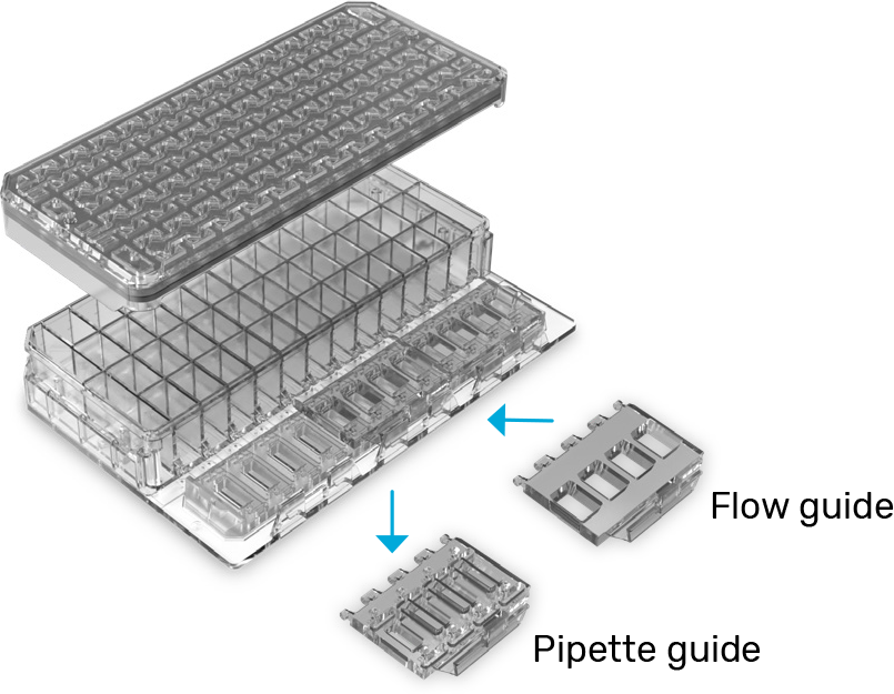 Chip-Array Basic Research Kit には、AVA Emulation System で96 サンプルの実験を行うためのコンポーネントがすべて含まれています。本キットは、Chip-Array 消耗品、Pipette guide、 Pipette guide cover、およびFlow guide で構成されています。Pipette guide は、ECMコーティング後に細胞をTop および Bottom チャネルに直接播種することを可能にします。一方、 Pipette guide cover はChip-Array をバイオセーフティキャビネットからAVA Emulation System へ移動する際に汚染のリスクを防ぎます。細胞播種後に、Pipette guide をFlow guide に交換し、Organ-Chip Emulations と培地リザーバー間のマイクロ流体回路が完成します。