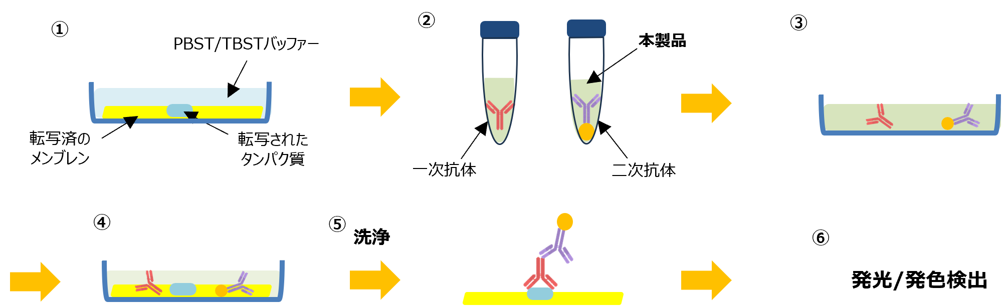 - ① ウエスタンブロッティングの転写後、メンブレンをPBST/TBSTバッファーに5分浸漬する。