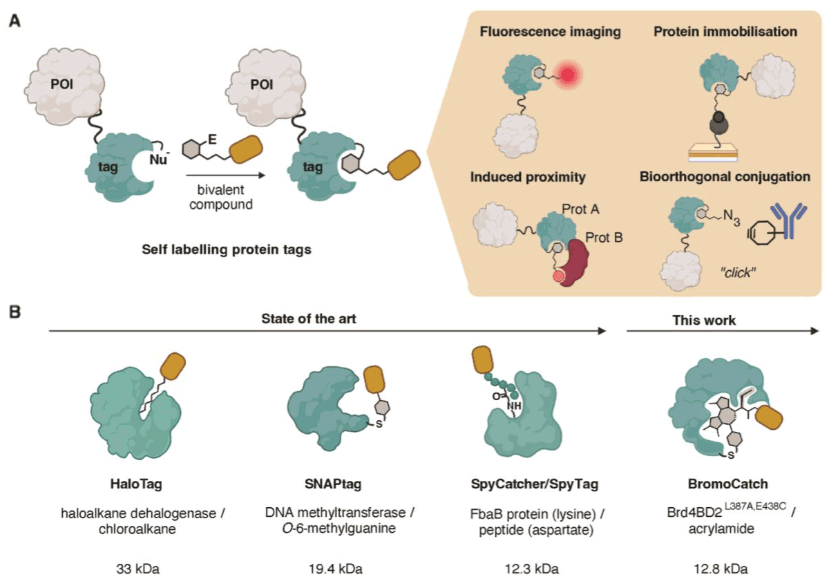 BromoCatchは、設計されたブロモドメインを基盤とする共有結合型タンパク質タグシステムであり、求電子性リガンドと選択的かつ迅速に反応します。これにより、生細胞、固定細胞、または細胞抽出液中のBromoCatch融合タンパク質を不可逆的に標識することが可能です。