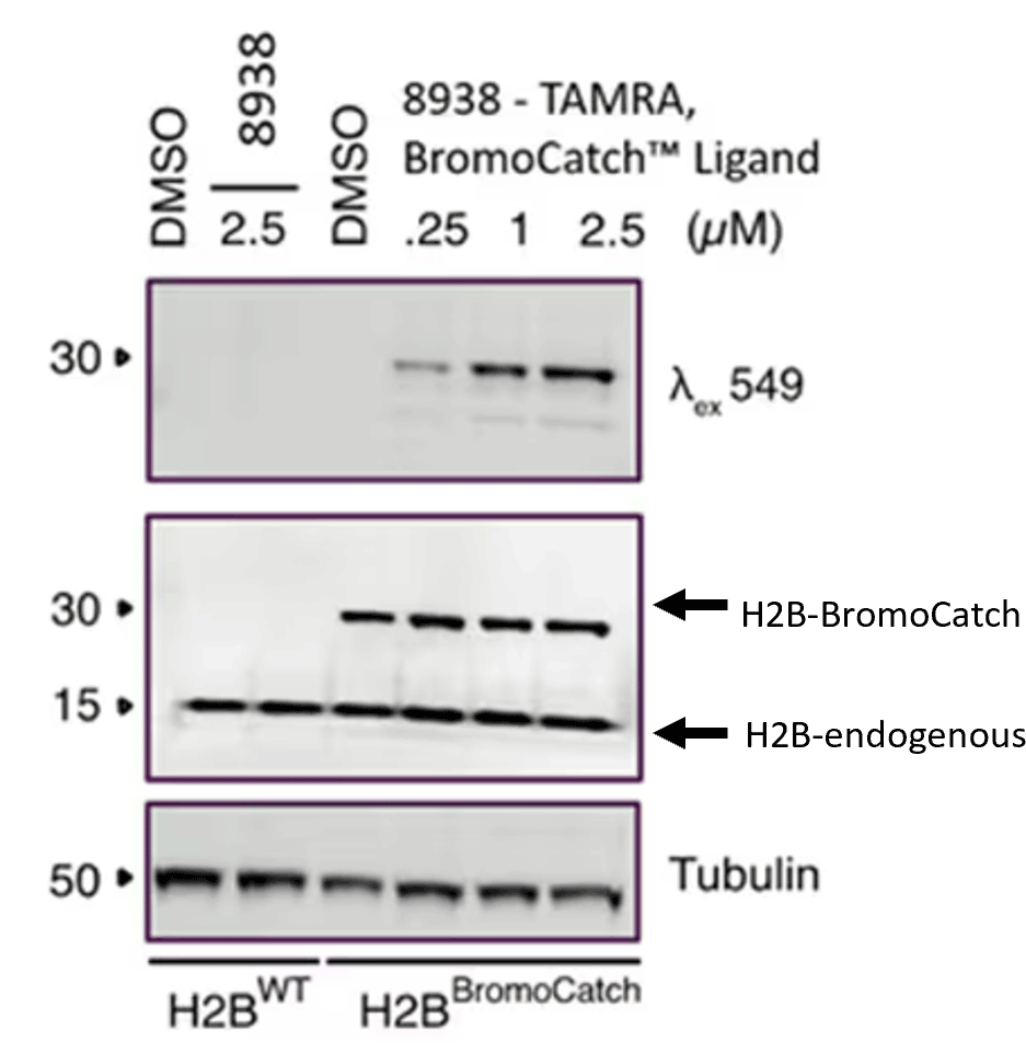TAMRA, BromoCatch Ligandは、0.25 μMにおいてもH2B-BromoCatchを補足した。リガンド濃度 最大2.5 μMにおいても、HEK293FT WT細胞における非特異的な結合は見られなかった。
