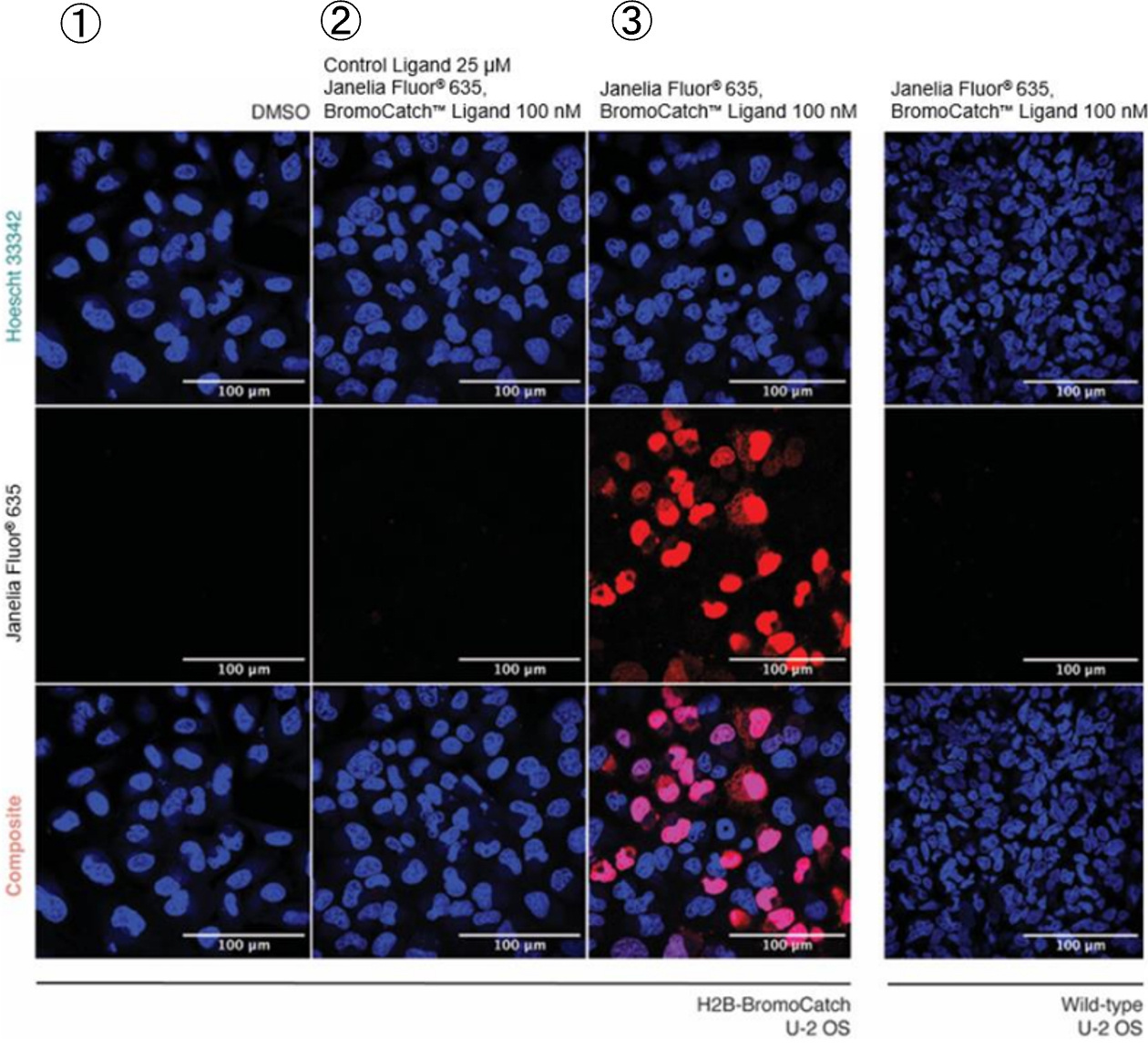 U-2 OS 細胞を➀DMSOのみ、➁100nM Janelia Fluor 635 BromoCatch Ligandかつブロモドメイン阻害剤として25µM BromoCatch Control Ligand (ET-JQ1-OMe)、 ➂100nM Janelia Fluor 635 BromoCatch Ligandの条件でそれぞれ8時間インキュベートした。その後、Hoechst 33342核対比染色およびJanelia Fluor 635の蛍光を共焦点顕微鏡で観察した。