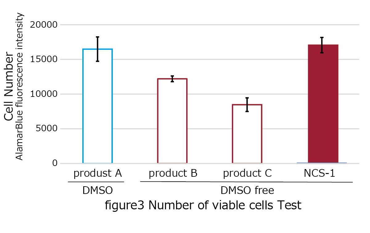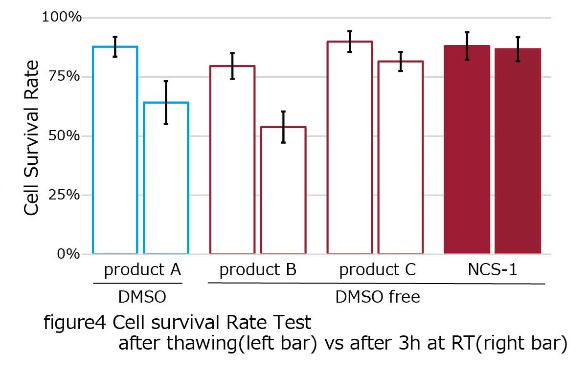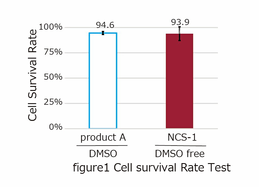 本品および従来の保存液 (10% - DMSO含有あるいは不含) を用いてヒト骨髄由来間葉系幹細胞 (BM-MSC) を継代して凍結保存後 (-80℃で2週間)、細胞生存率を算出した。本品はDMSOフリーであるにもかかわらず、本系ではDMSO含有保存液に劣らない保存性能を示した (図4:NCS-1)。 さらに、同条件で処理した被検群を融解してそのまま室温で3時間静置後に細胞生存率を算出した。本品は他のDMSO含有および不含保存液と異なり生存率の低下がほぼないことが確認された (図4:NCS-1)。保存液への長時間暴露において低ストレスであることがうかがわれた。