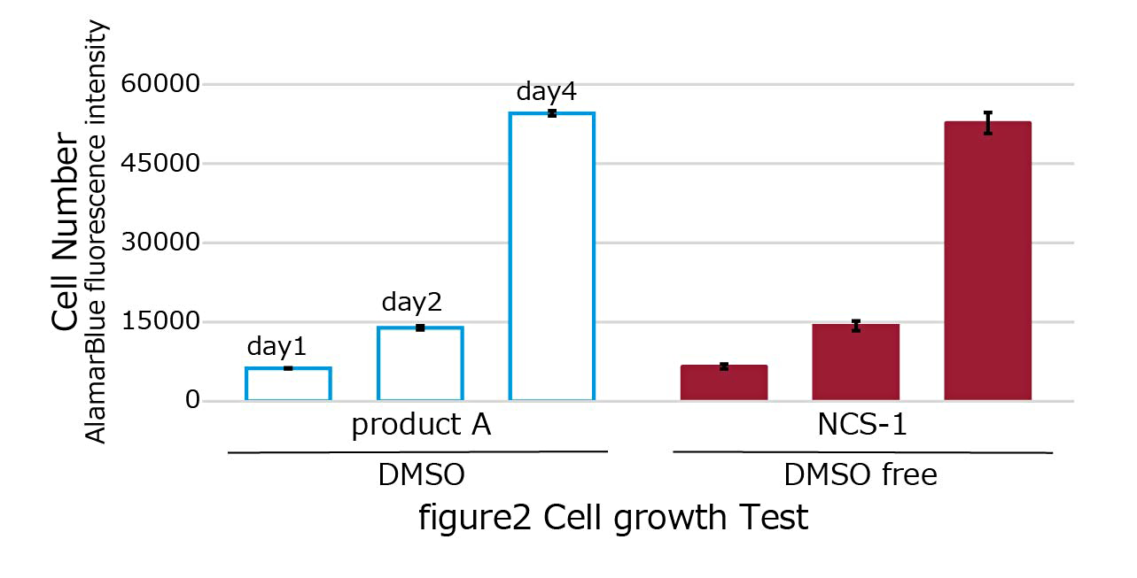 本品および従来の保存液 (10% - DMSO含有あるいは不含) を用いて正常ヒト繊維芽細胞 (NHDF) を過継代して凍結保存後 (-80℃で4ヵ月)、細胞数を算出した。本品はDMSOフリーであるにもかかわらず、本系ではDMSO含有保存液に劣らない結果が確認できた (図3:NCS-1)。また、一般的なDMSO不含保存液では細胞状態や保存期間によって保存性能がばらつく可能性が示唆された。
