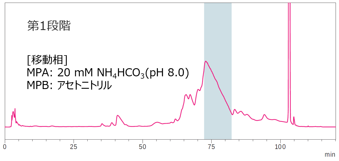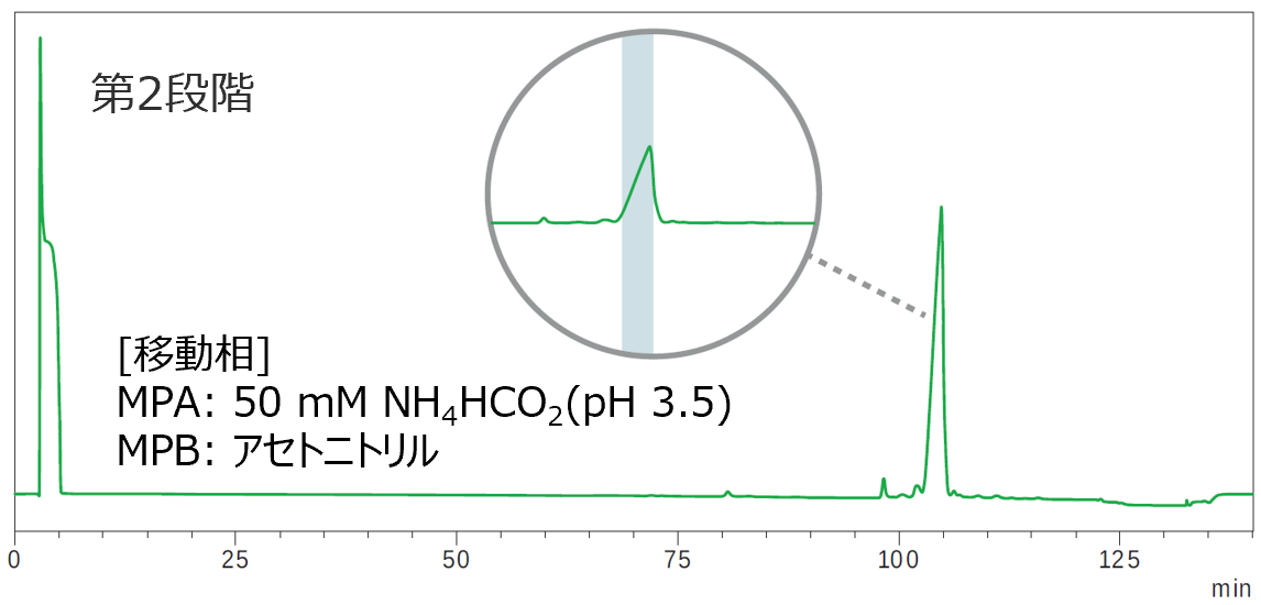 - 両工程ともResiPure™ Advanced C8を用い、第1段階は塩基性条件 (pH 8.0)、第2段階は酸性条件 (pH 3.5) で実施した。