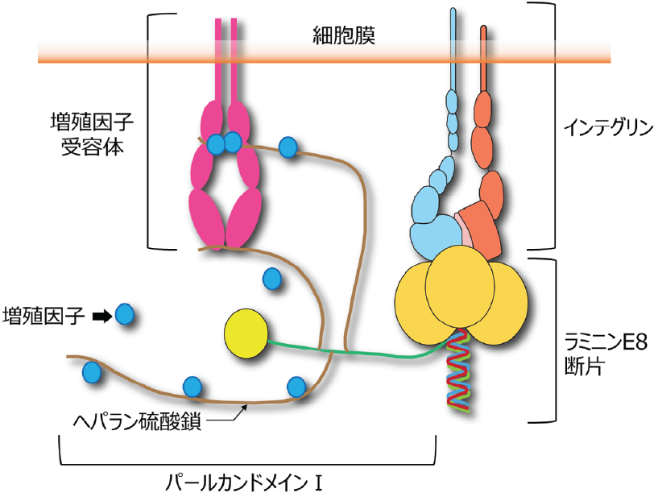 パールカンは基底膜と呼ばれるシート状の細胞外マトリックス (ECM;Extracellular matrix) に存在し、細胞の増殖や分化のシグナル伝達をサポートする役割を持っています。 パールカンのへパラン硫酸鎖 (HS) に、bFGF,VEGF,TGF-βなどの分子が捕捉されることで細胞にさまざまな影響を与えています。