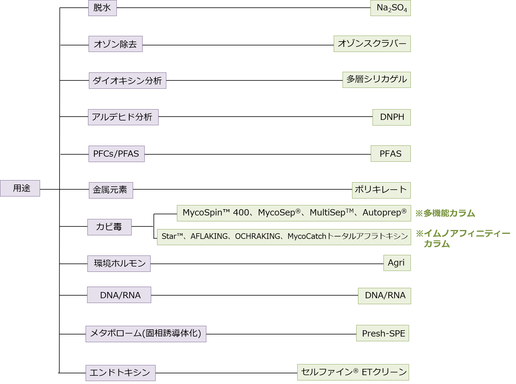 | カビ毒前処理用カラム | サンプル中のカビ毒を効率よく精製、濃縮する前処理用カラムです。 多機能カラム:MycoSpin™ 400、MycoSep®、MultiSep™、 Autoprep® イムノアフィニティ―カラム:Star™、AFLAKING・OCHRAKING、MycoCatchトータルアフラトキシン |