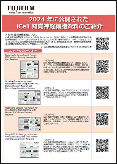 2024/2/3~2/7 | SLAS2024 International Conference and Exhibition | Large-scale Generation of Human iPSC-derived Sensory Neurons for Pain Research | iCell® Sensory Neurons の細胞性状について遺伝子発現、TTX耐性Na+チャネル由来電流測定など化学物質刺激に対する反応性、およびがん化学療法薬処置時の細胞毒性に関して検証したポスターです。 |