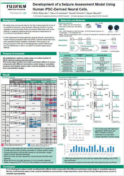 本ポスターは富士フイルム富山化学株式会社がiCell® 心筋細胞 2.0 に対して、アスピリンおよび hERG チャネルに対し異なる阻害機序を持つ薬剤 (E-4031、フルオキセチン、ブレフェルジンA、ペンタミジン) を 3日間曝露させた際の細胞外電位を MEA で検証した結果です。iCell® 心筋細胞 2.0 における FPDcF および心拍数は E-4031 曝露後から 72 時間まで延長および減少を示しました。一方、フルオキセチン曝露により、用量および時間依存的な FPDcF の短縮と心拍数の減少が認められました。さらに、ブレフェルジン A およびペンタミジンの曝露は、共に用量および時間依存的な FPDcF の延長および心拍数の減少を示し、高用量処置において心停止が認められました。 以上のことから、hERG チャネルに対し異なる阻害機序を持つ薬剤を長期曝露した際の心毒性を iCell® 心筋細胞2.0 において MEA アッセイにより検出可能であることが示されました。 |