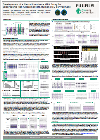 2022年 | Development of a Neural Co-culture MEA Assay for Seizurogenic Risk Assessment (ft. Human iPSC-derived Cells) | FCDI が公開した iCell® アストロサイトと iCell® グルタミン酸作動性神経細胞の共培養に関するポスターとなります。iCell® グルタミン酸作動性神経細胞を iCell® アストロサイトと共培養した際の電気生理活性について評価しています。共培養モデルは 単培養時の iCell® グルタミン酸作動性神経細胞よりも早期に自発発火を示し、より長期間電気生理活性を持続させます。 共培養モデルに 発作誘発性化合物、GABA-A 受容体選択的アゴニスト、そして神経活動を抑制する化合物を処置したところ、各化合物に対応する電気生理応答を示しました。 |