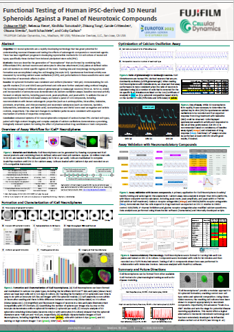 2023/9/1~9/13 | EUROTOX2023 | Functional Testing of Human iPSC-derived 3D Neural Spheroids Against a Panel of Neurotoxic Compounds | FCDI が公開した iCell® アストロサイト 2.0、iCell® グルタミン酸作動性神経細胞、そして iCell® GABA 作動性神経細胞をスフェロイド状に三者共培養した際の細胞内 Ca2+ イオン濃度動態を評価したポスターとなっております。三種の細胞を 3D 共培養することで、より脳の組成および構造に近い条件での実験が可能です。iCell® グルタミン酸作動性神経細胞と iCell® GABA 作動性神経細胞の比率を変更することで異なる自発発火パターンとなる他、各種化合物に対応した反応を示しました。 |