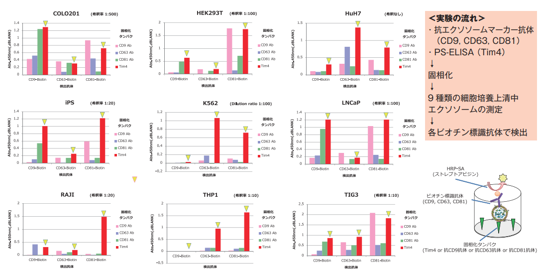 その結果、これまで同定することができなかったエクソソーム上の蛋白質や RNA を数多く同定することが可能となった。更に、Tim4 のエクソソームへの強い結合能を応用し、エクソソームを ELISA や FACS で高感度に検出・定量することが可能となった。また、マイクロベジクルは本来、分画遠心法で粗精製することしかできなかったが、Tim4 アフィニティー法を用いることで高純度なマイクロベジクルの精製も可能になった。