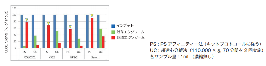 当社では金沢大学医学系免疫学 華山教授と共同で、エクソソームの表面に存在するホスファチジルセリン(PS)とカルシウムイオン依存的に結合するタンパク質Tim4を利用したPSアフィニティー法を確立し、本手法を用いたエクソソーム単離キットを開発しました。本キットにより、従来法と比較して高純度かつダメージの少ないエクソソームの単離が可能となりました。