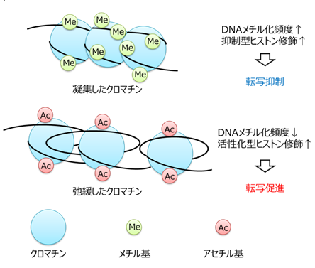 エピジェネティクスとは、「DNA配列の変化を伴わず、DNAやそれを取り巻くタンパク質の化学修飾により遺伝子発現が制御される生命現象」を指しており、遺伝子発現の多様性やがんなど種々の疾患に深く関与します。DNAメチル化やヒストン修飾(メチル化、アセチル化など)とその機能解析、また創薬研究が盛んに進められています。