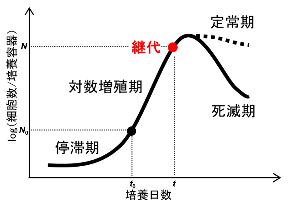 細胞は右図のような増殖曲線を描いて増殖します。停滞期や対数増殖期初期は細胞数も少なく、継代に適しません。定常期以降の状態は細胞の種類や培養条件によって異なります。恒常的な状態を維持するためには対数増殖期後期に細胞を継代する必要があります。