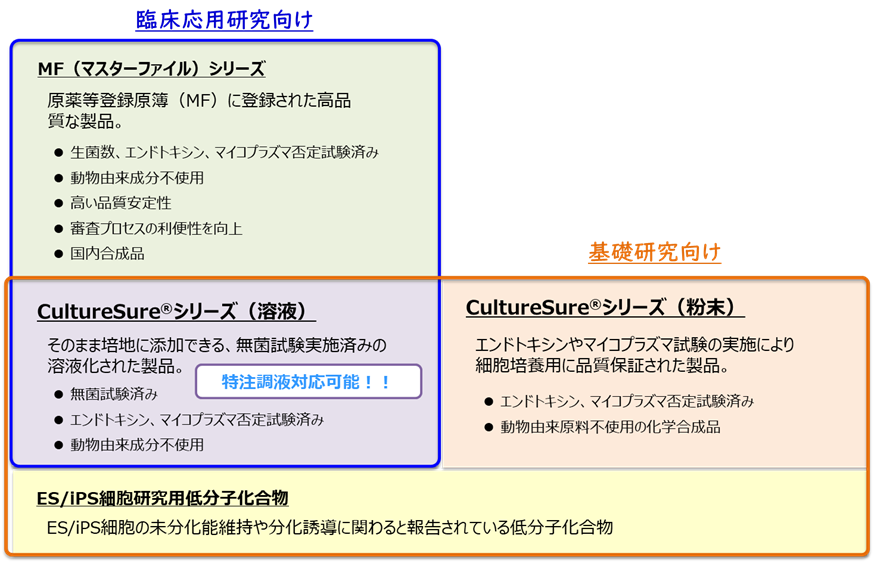 ICH-Q7(原薬GMP)に準拠した再生医療品等製品の商業生産向けの原材料です。GMP設備・管理体制で製造されています。今後もラインアップを拡充していく予定です。