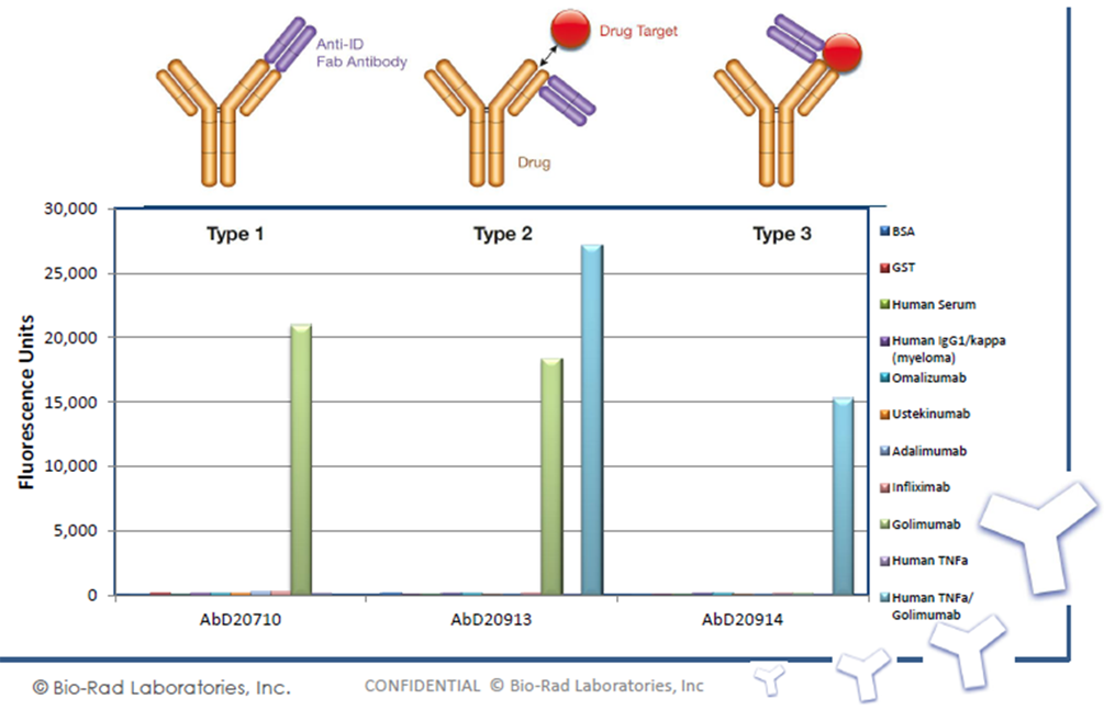 ターゲット抗体の抗原結合部位の外側のイディオトープに結合し、サンプル中の遊離抗体と結合抗体の両方を検出することができます。