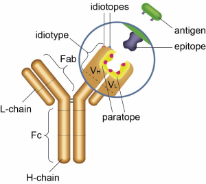 抗イディオタイプ抗体とは、抗原結合部位を含む抗体に固有の可変領域 (イディオタイプ: Idiotype) 内のエピトープ (イディオトープ: Idiotope) に結合する抗体のことです。イディオトープの組み合わせは各抗体に固有であるため、抗イディオタイプ抗体は、1つのモノクローナル抗体に特異的に結合するように作製することができます。