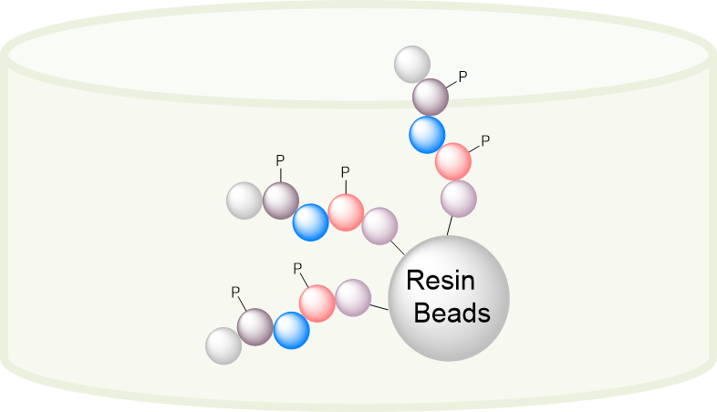 樹脂ビーズ上でアミノ酸残基を伸長した後、酸処理等により粗体ペプチドを切り出します。