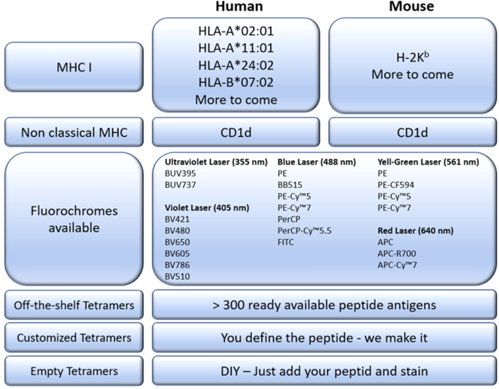 Tetramer Store社は抗原特異的T細胞の迅速で簡単な検出を実現するテトラマーを提供しています。ご使用用途に合わせて既存製品、カスタム製品もしくはペプチドを含まないEmpty MHCテトラマーを提供しています。